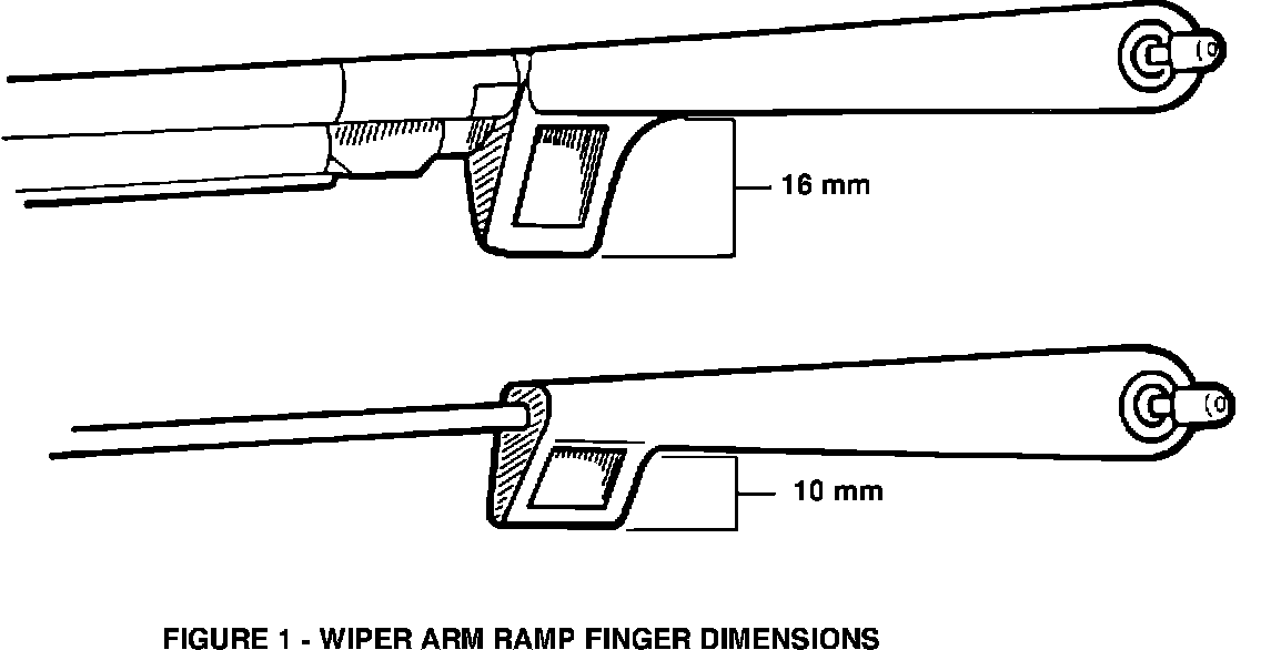 The ramp finger rubbing on the windshield is caused by opening the hood assembly far enough to contact the right wiper arm assembly. This slightly deforms the wiper blade superstructure which in turn allows the ramp finger to contact the glass and scratch the surface. After VIN breakpoints LY147121 (Wilmington) and LE165062 (Linden), wiper arms used in production have the ramp finger reduced from 16 to 10 mm, refer to Figure