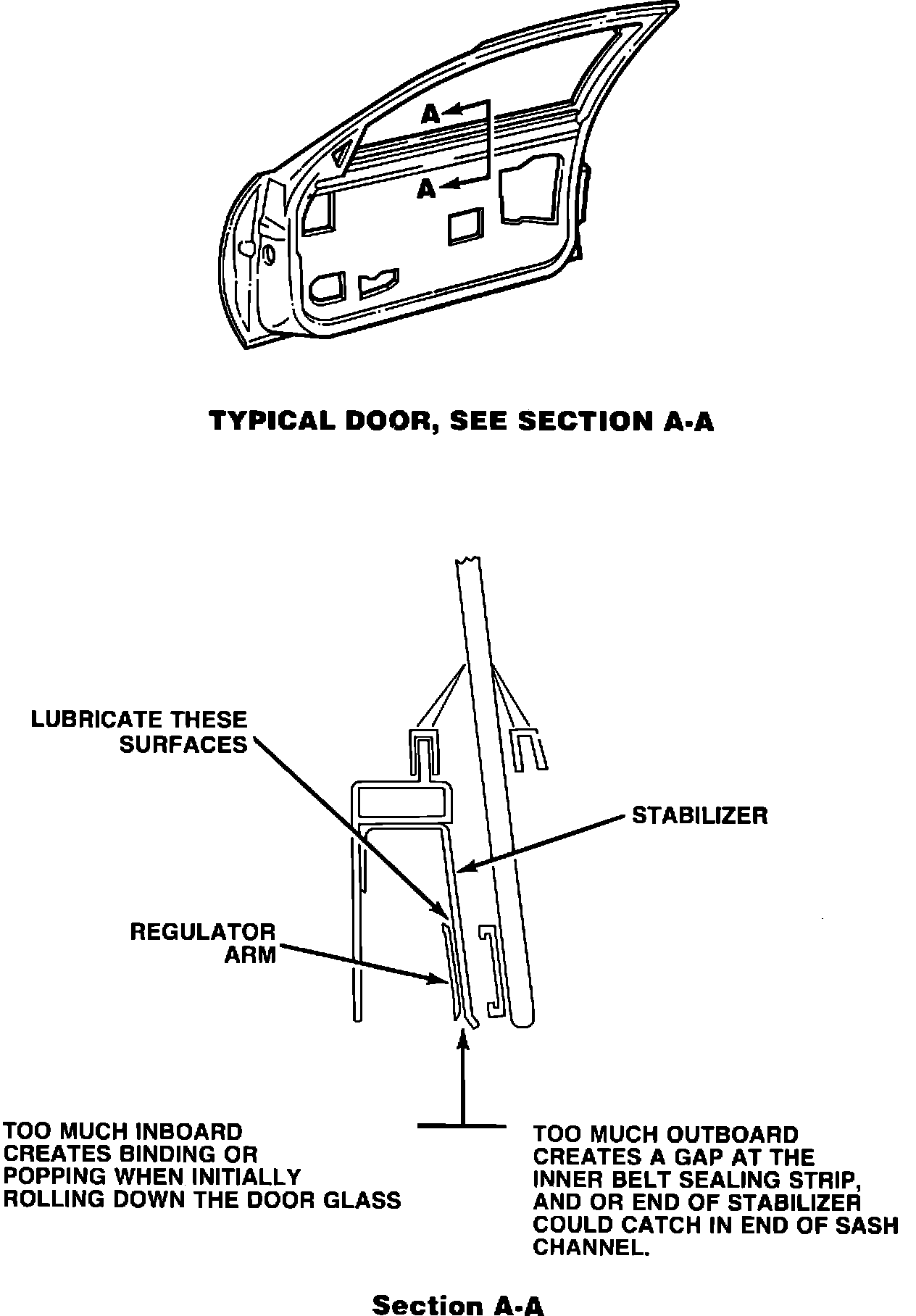 Condition: Some customers may comment about a binding or popping noise on 1988-89 L-car front door glass when the glass is initially rolled down, or road noise caused by a gap between the front door glass and inner belt sealing strip with the glass in full up position.