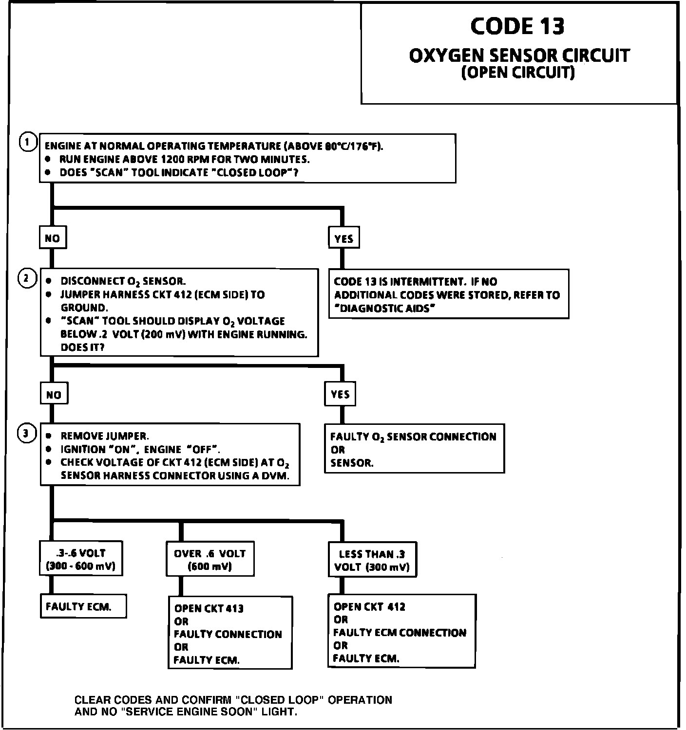 Normal "Scan" voltage varies between 100 mv to 999 mv (0.1 and 1.0 volt) while in closed loop. Code 13 sets in one minute if voltage remains between 0.35 and 0.55 volt, but the system will go "Open Loop" in about 15 seconds. Refer to TESTING PROCEDURES/DIAGNOSIS BY SYMPTOM/INTERMITTENTS.