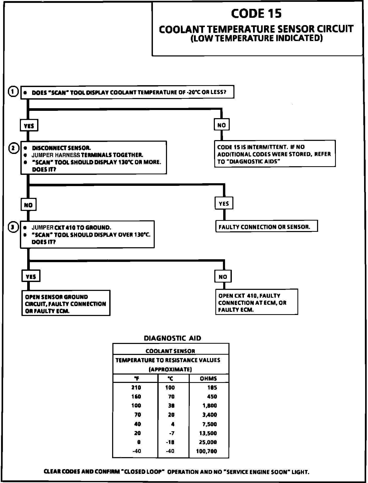 1. Code 15 will set if Signal voltage indicates a coolant temperature less than -44~C (-47~F) for 3 seconds.
