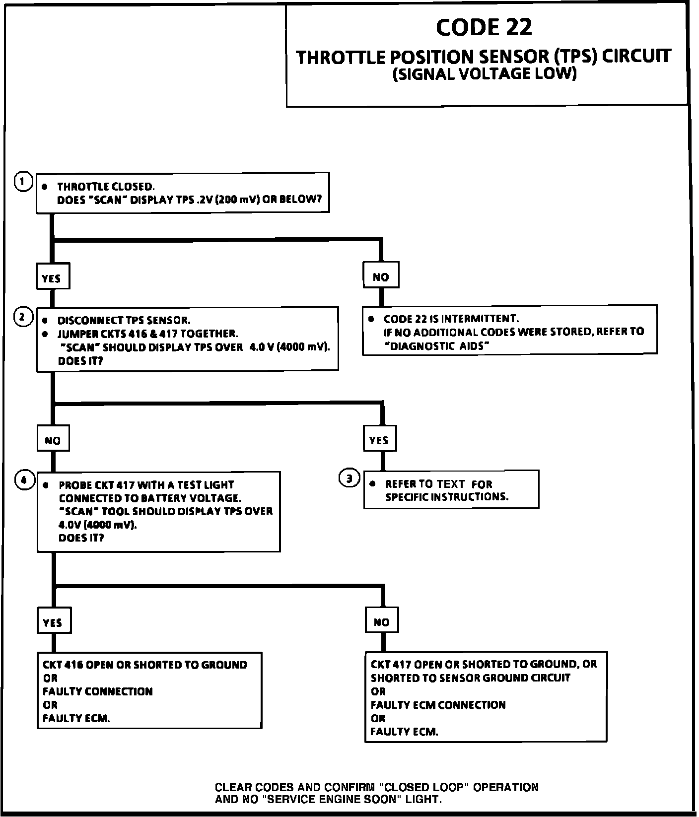 A "Scan" tool reads throttle position in volts. Voltage should increase at a steady rate as throttle is moved toward WOT. An open or short to ground in CKTs 416 or 417 will result in a Code 22. Refer to TESTING PROCEDURES/DIAGNOSIS BY SYMPTOM/INTERMITTENTS.