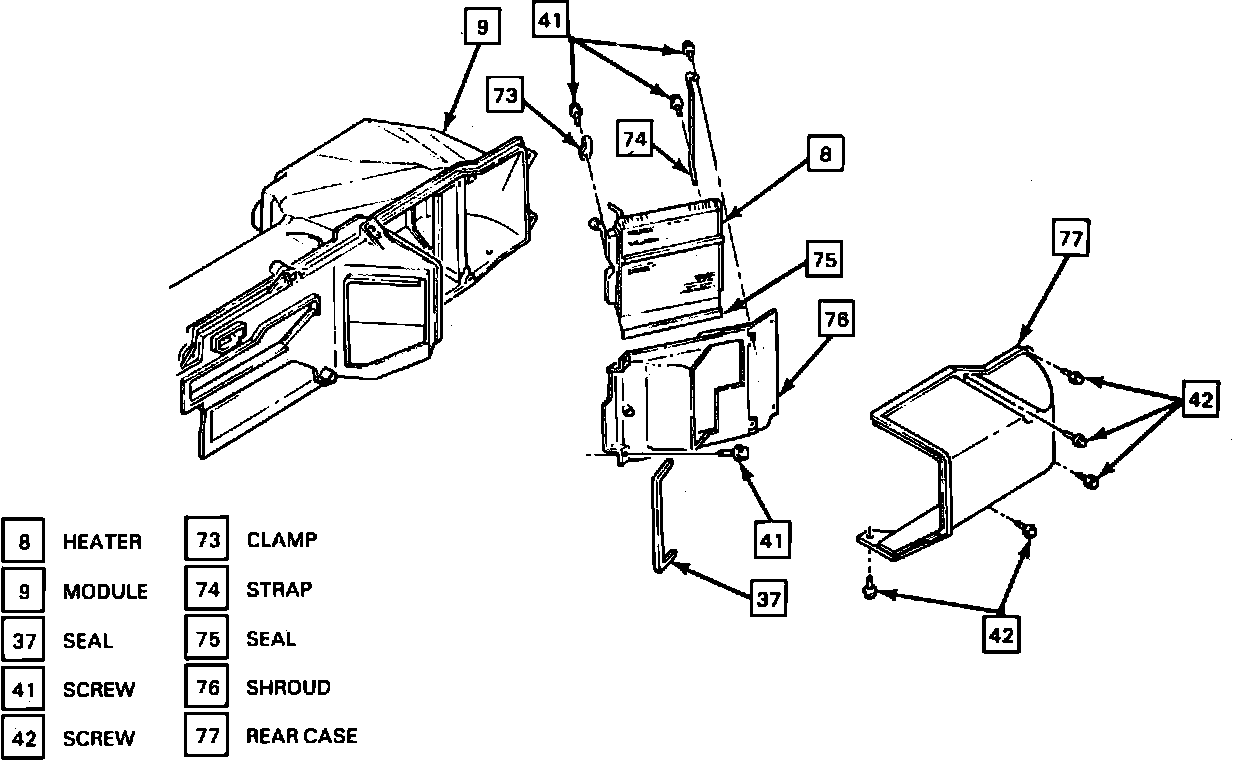 5. Remove heater core shroud screws, then separate heater case assembly.