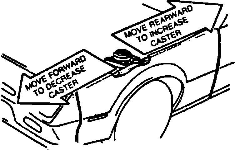Caster adjustments are made by moving the position of the upper strut mount assembly, Fig. 1. To make adjustment, remove dust cap and fender bolt and attach tool J-29724 to original fender bolt, Fig. 2. Tighten the turnbuckle and loosen the three strut mount attaching nuts.