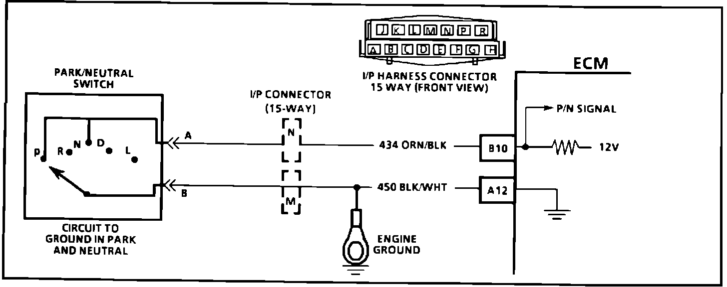 The PARK/NEUTRAL switch contacts are closed to ground in park or neutral and open in drive ranges. The ECM supplies ignition voltage through a current limiting resistor to circuit 434, and senses a closed switch when the voltage on circuit 434 drops to less than one volt. The ECM uses the P/N signal as one of the inputs to control idle air, vehicle speed sensor diagnostics, and exhaust gas recirculation. If circuit 434 indicates a grounded P/N switch, while in the drive range, the EGR would be inoperative and engine detonation may result. If circuit 434 always indicates drive (open), a drop in idle speed may exist when the gear selector is moved into the drive range.