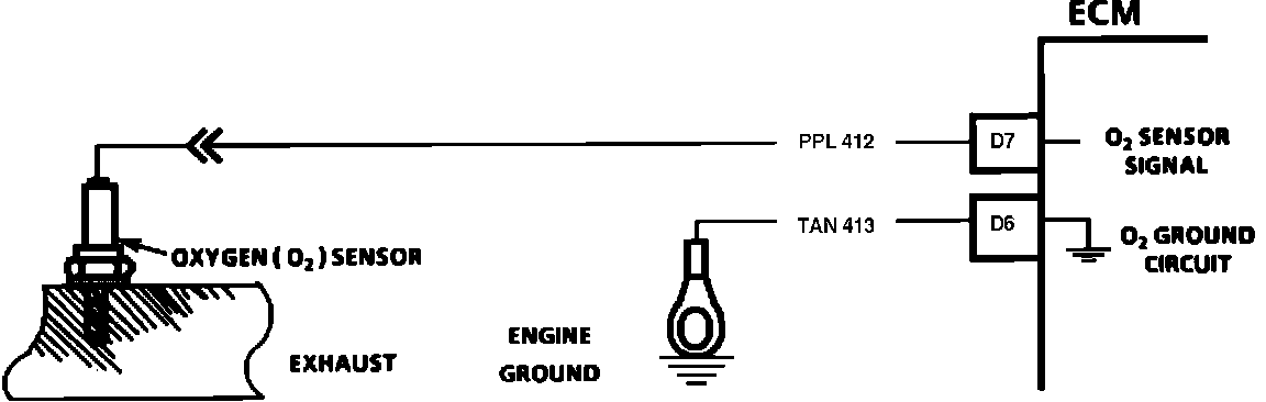 The Electronic Control Module (ECM) supplies a voltage of about 0.45 volt between terminals "D7" and "D6". (If measured with a 10 megohm digital voltmeter, this may read as low as 0.32 volt.) The 02 sensor varies the voltage within a range of about 1 volt if the exhaust is rich, down through about 0.10 volt if exhaust is lean. The sensor is like an open circuit and produces no voltage when it is below 316~C (600~F). An open sensor circuit or cold sensor causes open loop operation.