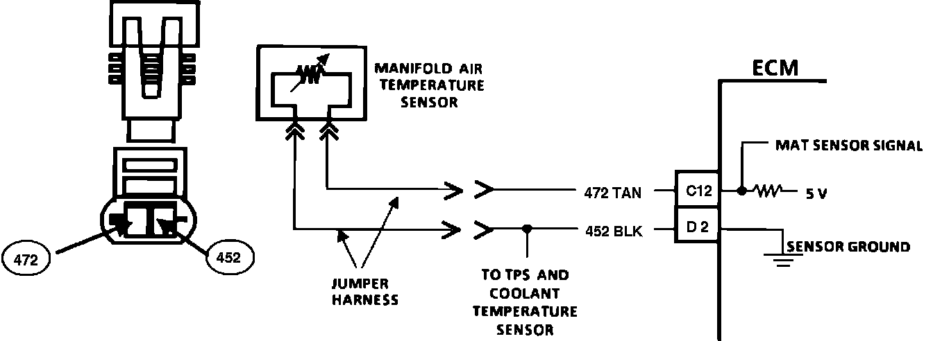 The Manifold Air Temperature (MAT) sensor uses a thermistor to control the signal voltage to the Electronic Control Module (ECM). The ECM applies a voltage (4-6 volts) on CKT 472 to the sensor. When the air is cold the sensor (thermistor) resistance is high, therefore the ECM will see a high signal voltage. If the air is warm the sensor resistance is low therefore the ECM will see a low voltage.