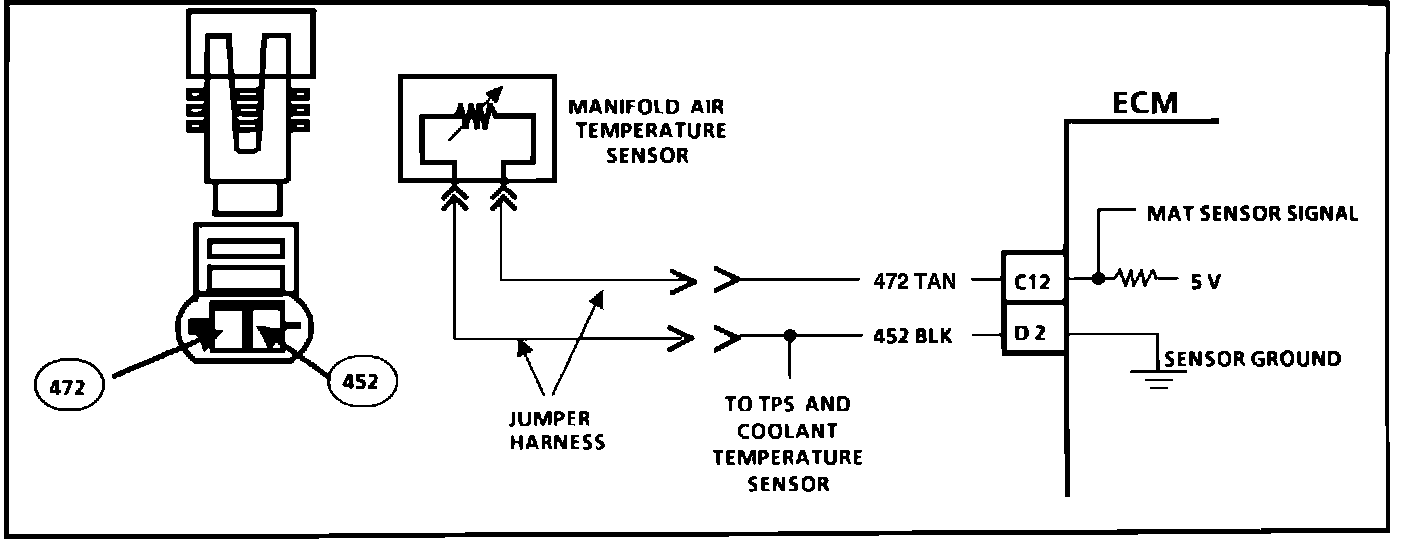 The Manifold Air Temperature (MAT) sensor uses a thermistor to control the signal voltage to the Electronic Control Module (ECM). The ECM applies a voltage (4-6) on CKT 472 to the sensor. When manifold air is cold the sensor (thermistor) resistance is high, therefore the ECM will see a high signal voltage. As the air warms, the sensor resistance becomes less, and the voltage drops.