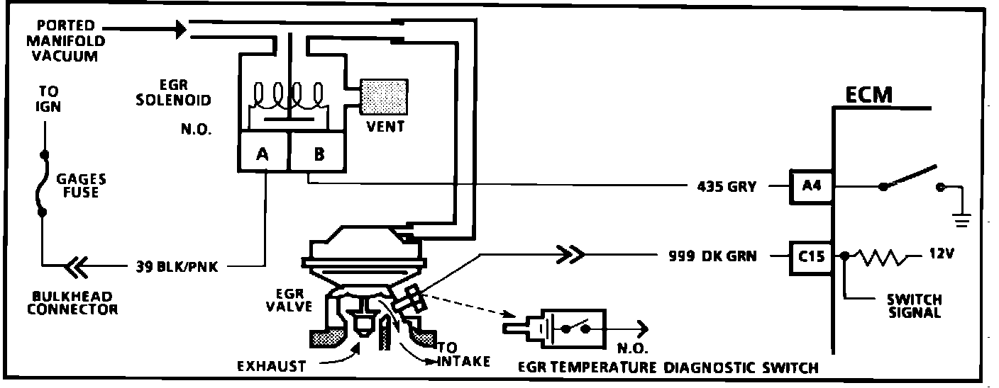 The Exhaust Gas Recirculation (EGR) valve vacuum is controlled by an Electronic Control Module (ECM) controlled solenoid. The ECM will turn the EGR "ON" and "OFF" (Duty Cycle) by grounding CKT 435. The duty cycle is calculated by the ECM based on information from the coolant and mass air flow sensor and engine rpm's. There should be "NO EGR" when in Park or Neutral, TPS input below a specified value or Throttle Position Sensor (TPS) indicating Wide Open Throttle (WOT). With the ignition "ON", engine stopped, the EGR solenoid is de-energized and by grounding the diagnostic terminal, the solenoid is energized.