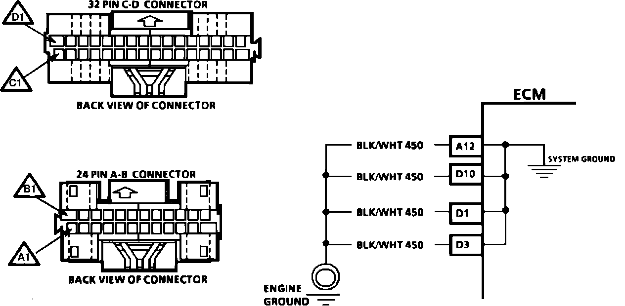 NOTE: Because of all the possible color code combinations used on electrical wiring diagrams, always refer to ECM CONNECTOR IDENTIFICATION under ELECTRICAL AND ELECTRONIC WIRING DIAGRAMS for correct color code identification of circuit.
