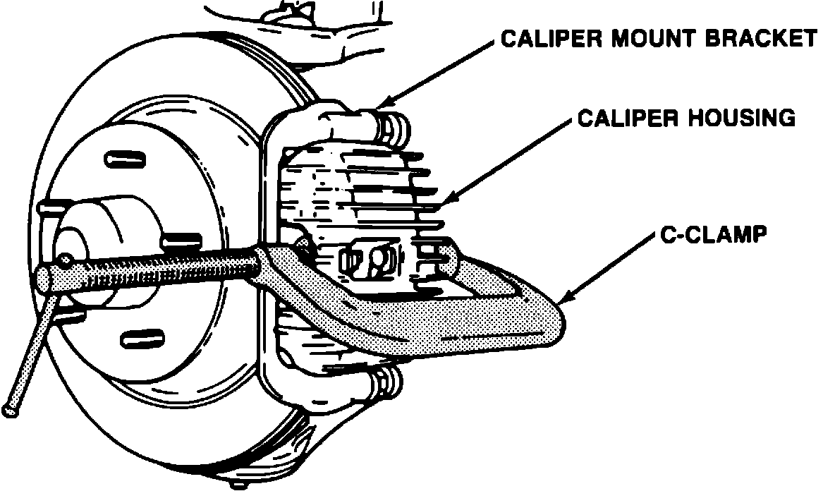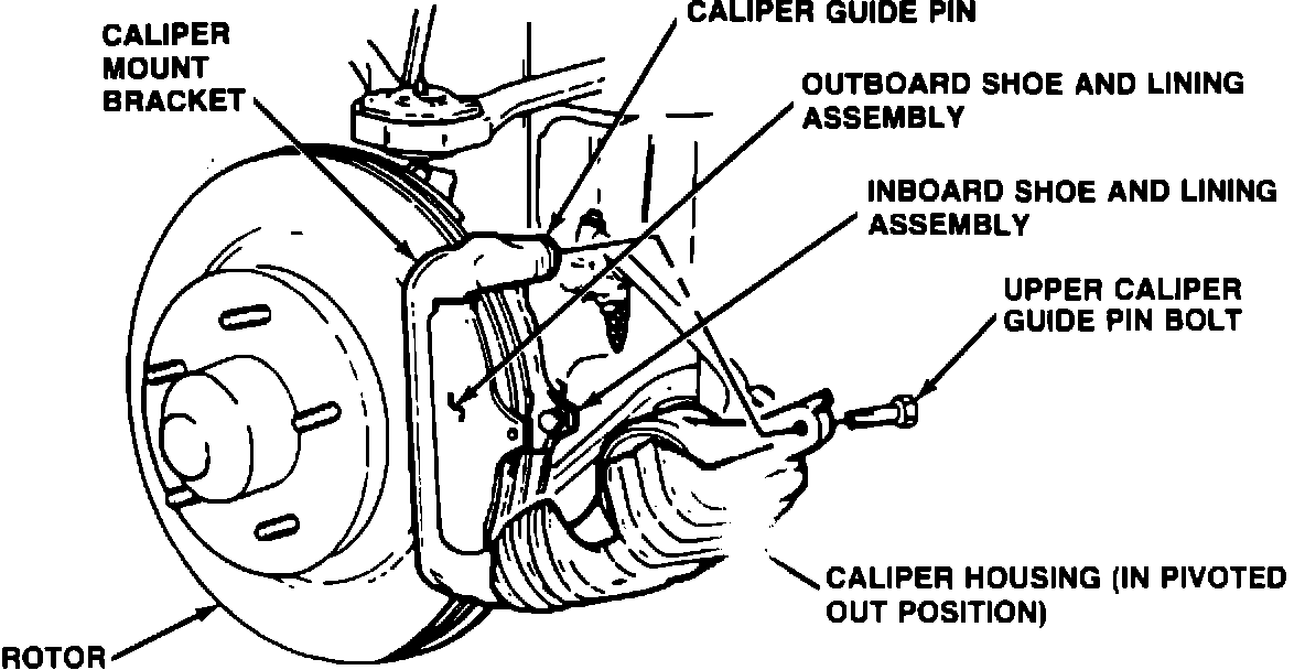 8. Bottom the caliper pistons (See Figure # 2). Then, remove the upper guide pin bolts and pivot the calipers out (See Figure # 3).