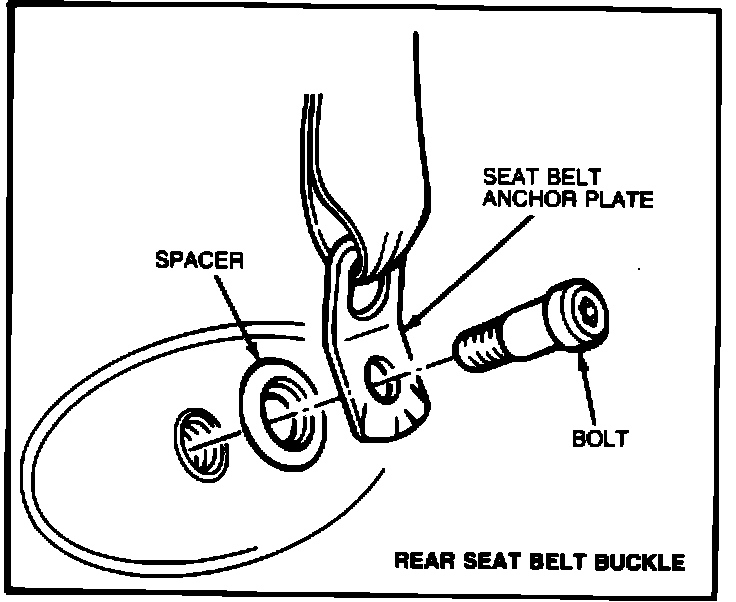 3. Remove bolts attaching rear seat belt buckles to floor anchors (see Illustration). Retain spacer for reuse.