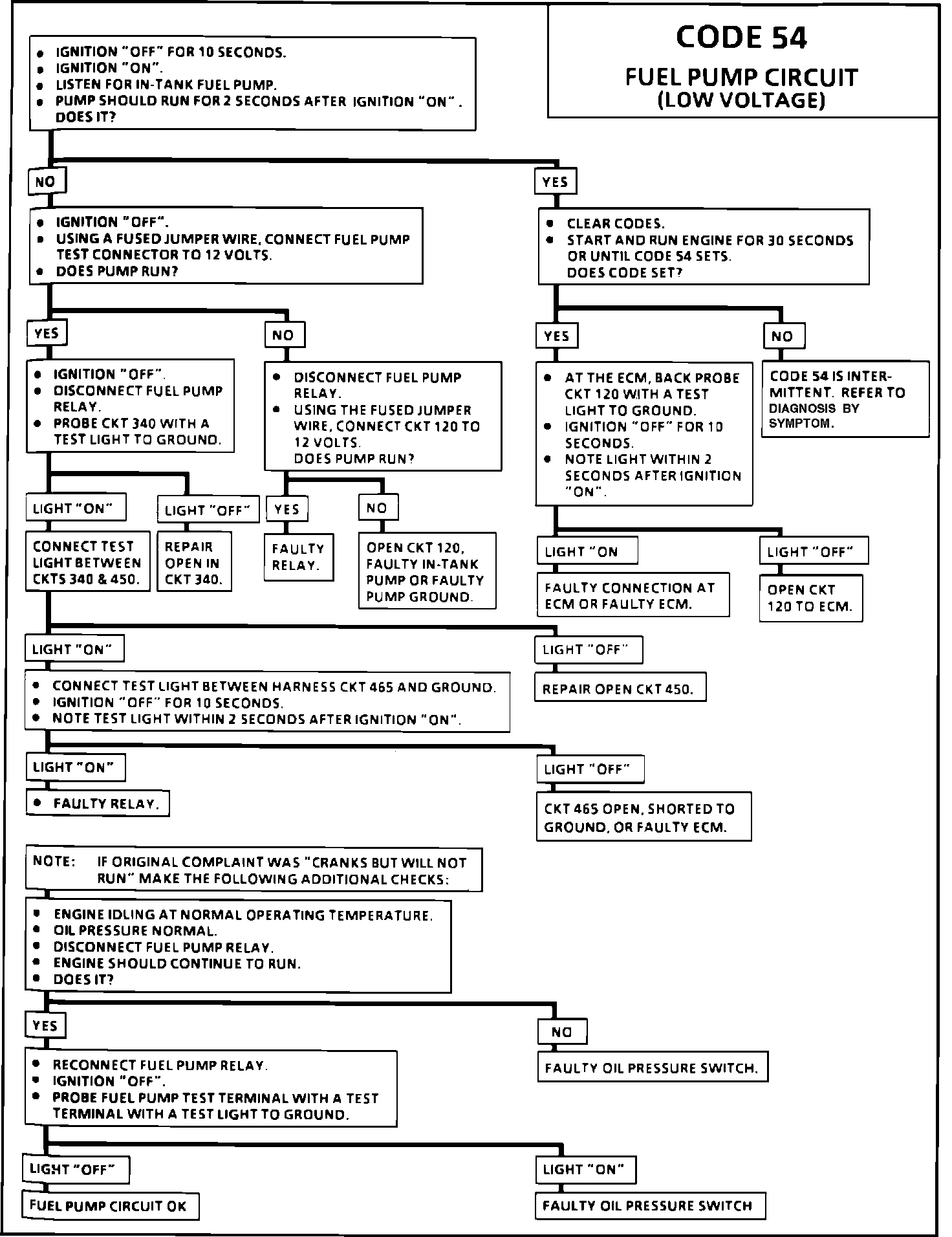 When the ignition switch is turned "ON," the ECM will energize the fuel pump relay and the in-tank fuel pump. It will remain "ON" as long as the engine is cranking or running, and the ECM is receiving ignition reference pulses. If there are no reference pulses, the ECM will shut "OFF" the fuel pump within 2 seconds after the ignition is "ON" or engine stops. Should the fuel pump relay or the 12.0 volts used to drive the relay fail, the fuel pump will be controlled through the oil pressure switch back-up circuit. A Code 54 will set if the ECM does not sense the 12.0 volt signal at terminal "B2" during the 2 seconds that the ECM is energizing the fuel pump relay.