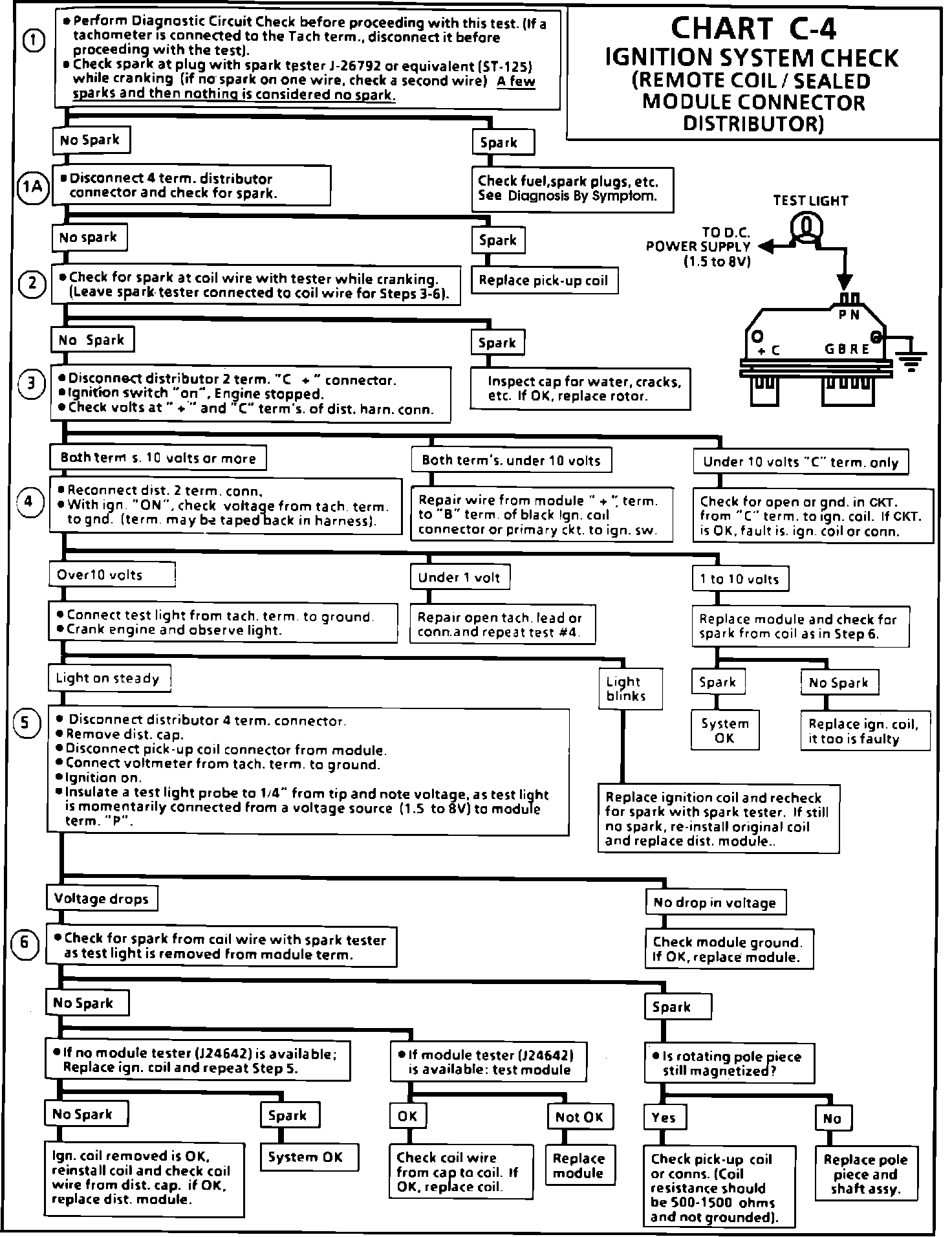 6. This should turn "OFF" the module and cause a spark. If no spark occurs, the fault is most likely in the ignition coil because most module problems would have been found before this point in the procedure. A module tester could determine which is at fault.
