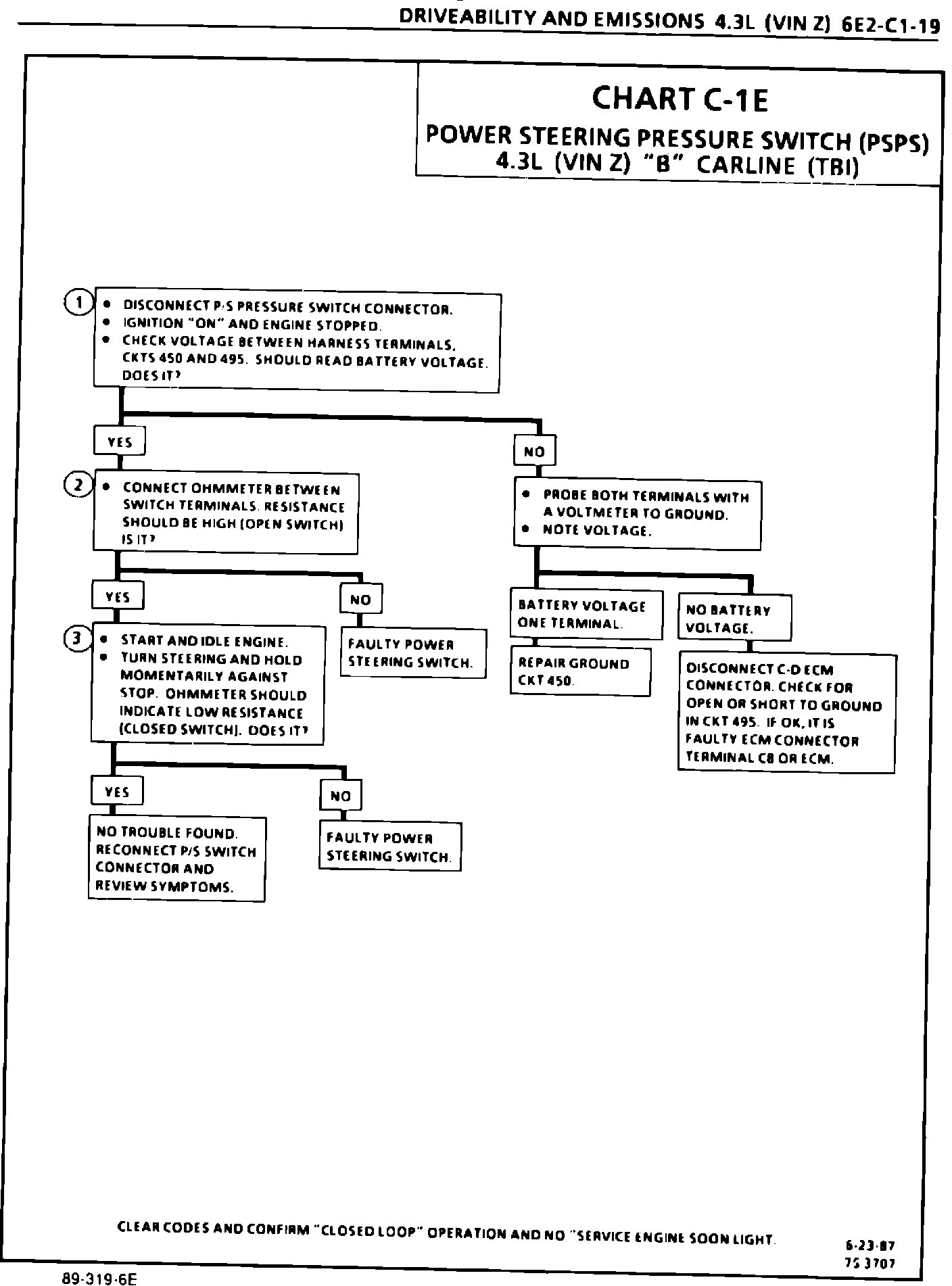 The attached Power Steering Pressure Switch (PSPS) Diagnostic Chart C-1E and Facing Page should be added to the 1989 4.3L (VIN Z) "B" Carline Service Manual. This chart should be placed at the end of DRIVEABILITY AND EMISSIONS (SECTION 6E2-C1) as pages 6E2-C1-18 and 6E2-C1-19.