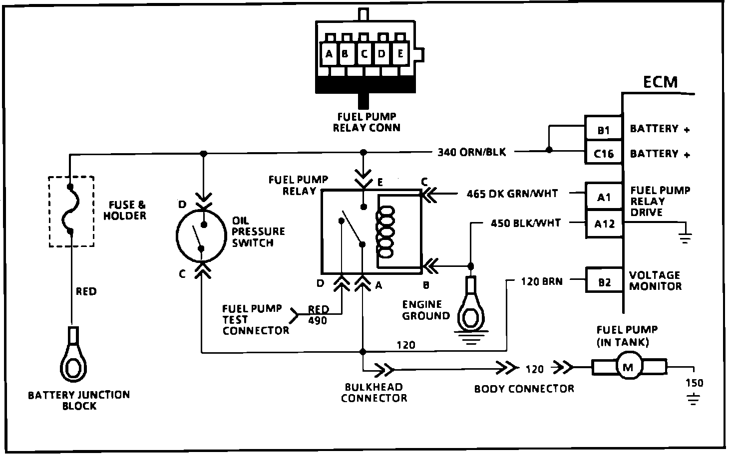 The oil pressure switch is mounted on the engine. This switch operates as a parallel power supply with the fuel pump relay to supply battery voltage to the fuel pump. Voltage is supplied to the fuel pump after approximately 28 kPa (4 PSI) oil pressure is reached.