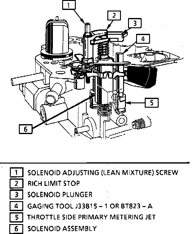 3. Install mixture control solenoid gaging Tool J-33815-1 or BT-8253-A, (or equivalent), over the throttle side metering jet rod guide, and temporarily reinstall the solenoid plunger into the solenoid body.