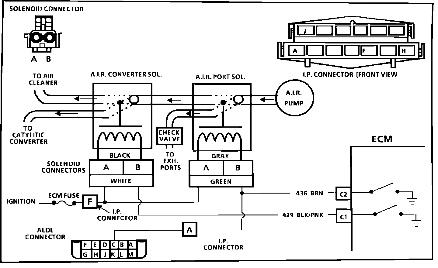 The air management system is controlled by a port and a converter valve. Both valves are controlled by the ECM. When the solenoid is grounded by the ECM, the A.I.R. pump pressure will activate the valve and pump air will be directed as follows. During cold start, the port solenoid is energized, which opens the port valve, and air is directed into the exhaust ports. As coolant temperature increases, or system goes into "Closed Loop", the port solenoid is de-energized, and the converter solenoid is activated, which allows the converter valve to be seated, and air is forced to the catalytic converter. If both solenoids are powered off, the air will be diverted to the atmosphere.