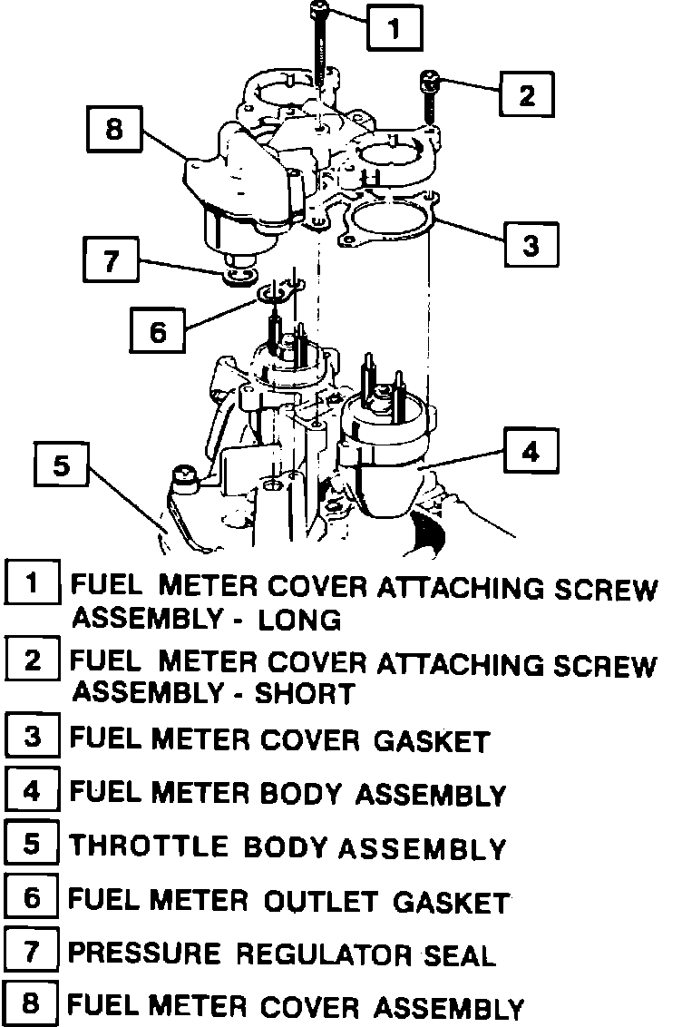 The fuel meter cover contains the fuel pressure regulator and is serviced as a complete preset unit. Do not attempt to remove the four pressure regulator-to-fuel meter cover attaching screws as the pressure regulator is spring loaded and, if tension is released, could cause injury.