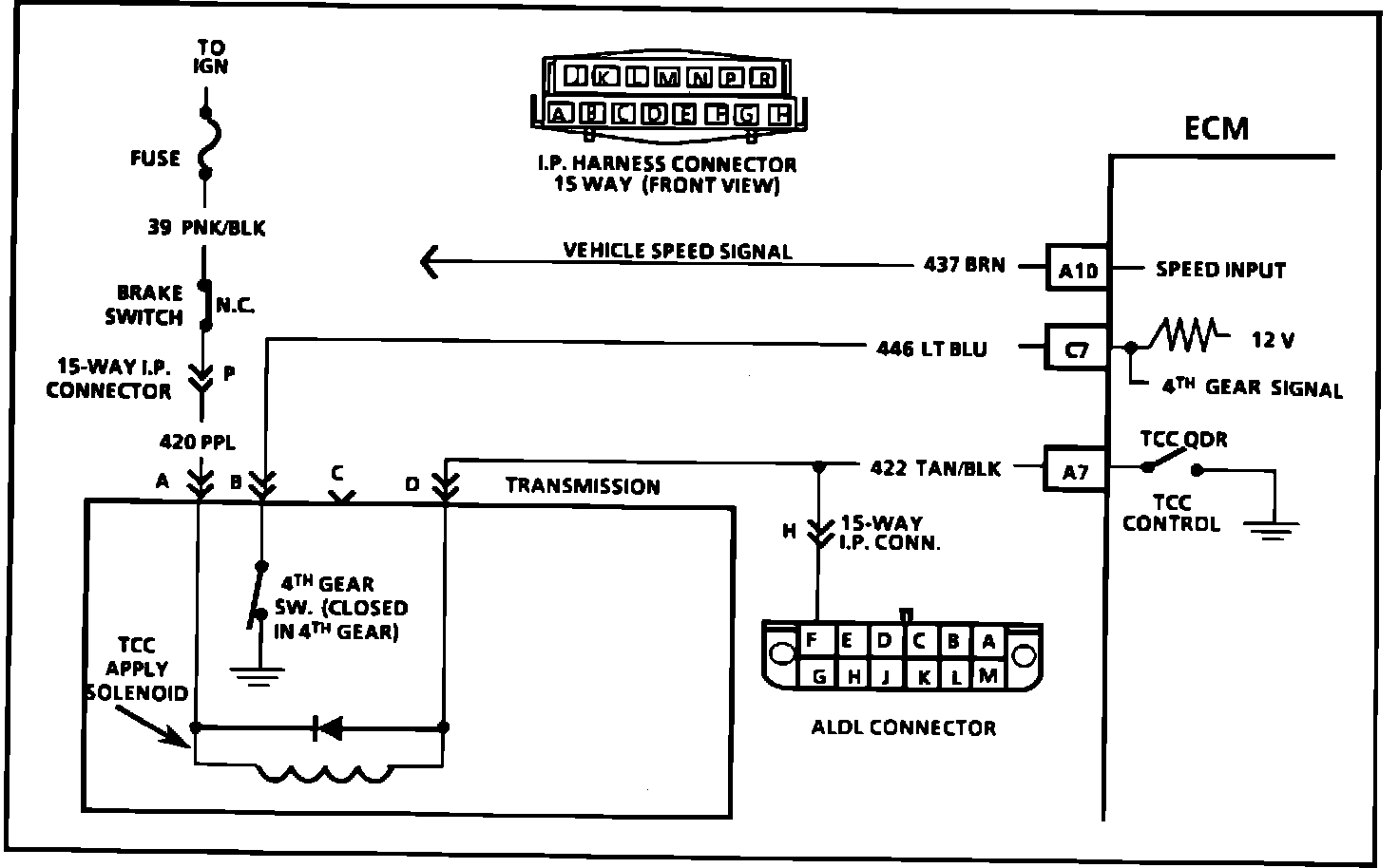 2. Disconnecting the TCC connector simulates an open switch to determine if circuit 446 is shorted to ground, or the problem is in the transmission.