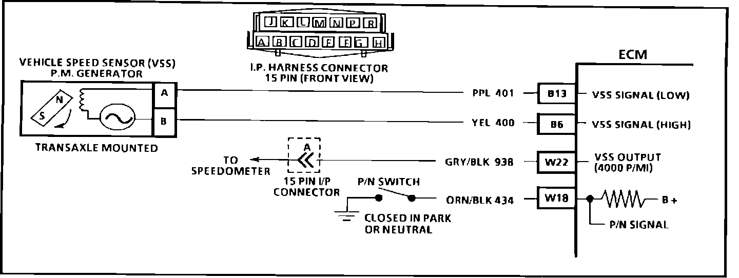 Vehicle speed information is provided to the ECM by the Vehicle Speed Sensor (VSS). It is a Permanent Magnet (PM) generator and is mounted in the transmission. The generator produces a pulsing voltage whenever the vehicle speed is over 3 mph. The voltage level and number of pulses increase as the vehicle's speed increases. The ECM converts the pulse voltage into miles per hour. This data is used for calculations and can be displayed on the "Scan" tool. The function of the VSS buffer has been incorporated into the ECM. The ECM amplifies the signal for the instrument panel, 4000 pulses per mile, for operating the odometer and speedometer. If the vehicle is equipped with cruise control, the ECM also provides a signal (2000 pulses per mile) to the cruise control module.