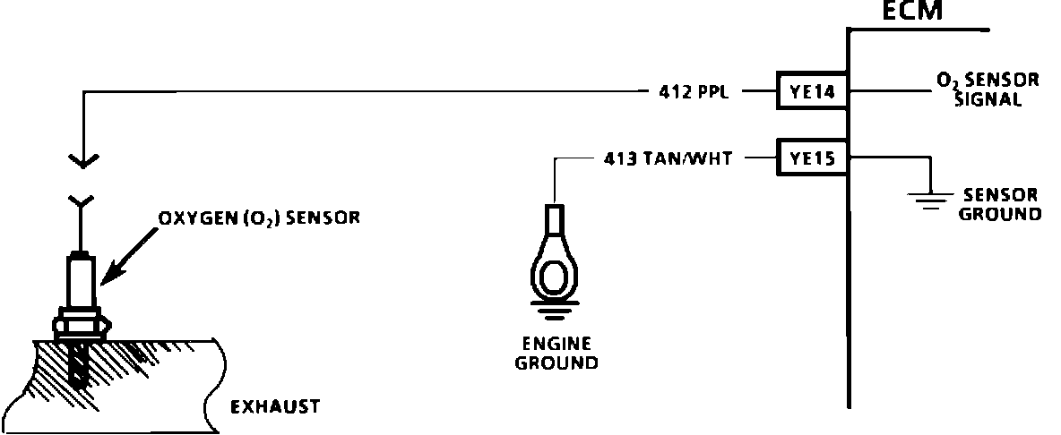 The Electronic Control Module (ECM) supplies a voltage of about 0.45 volt between terminals "YE14" and "YE15". (If measured with a 10 megohm digital voltmeter, this may read as low as 0.32 volt.) The O2 sensor varies the voltage within a range of about 1 volt if the exhaust is rich, down through about 0.10 volt if exhaust is lean. The sensor is like an open circuit and produces no voltage when it is below 316~C (600~F). An open sensor circuit or cold sensor causes "Open Loop" operation.