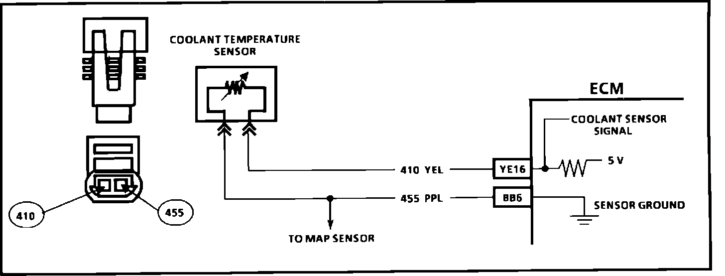 The Coolant Temperature Sensor uses a thermistor to control the signal voltage to the Electronic Control Module (ECM). The ECM applies a voltage on CKT 410 to the sensor. When the engine is cold the sensor (thermistor) resistance is high, therefore the ECM will see high signal voltage, As the engine warms, the sensor resistance becomes less, and the voltage drops. At normal engine operating temperature (85~C to 95~C) the voltage will measure about 1.5 to 2.0 volts.