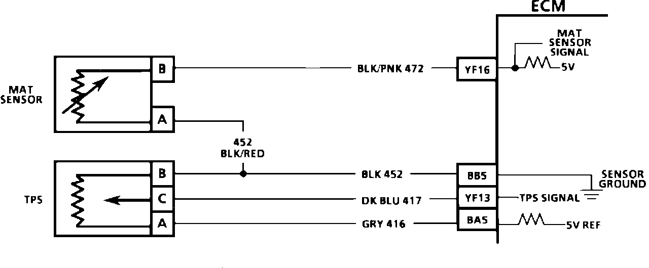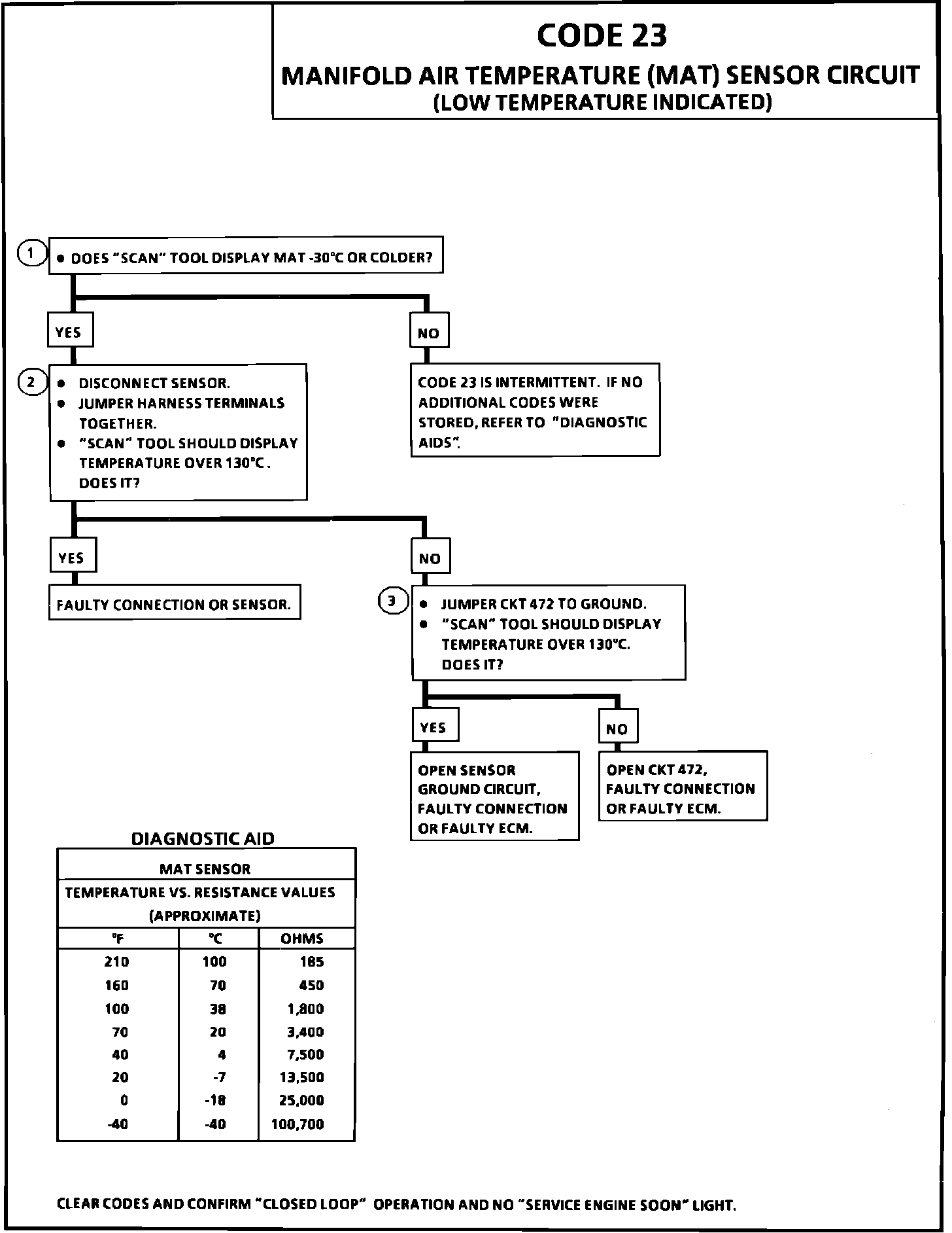 A "Scan" tool reads temperature of the air entering the engine and should read close to ambient air temperature when engine is cold, and rises as underhood temperature increases. A faulty connection, or an open in CKT 472 or 452 will result in a Code 23. Refer to TESTING PROCEDURES/DIAGNOSIS BY SYMPTOM/INTERMITTENTS.