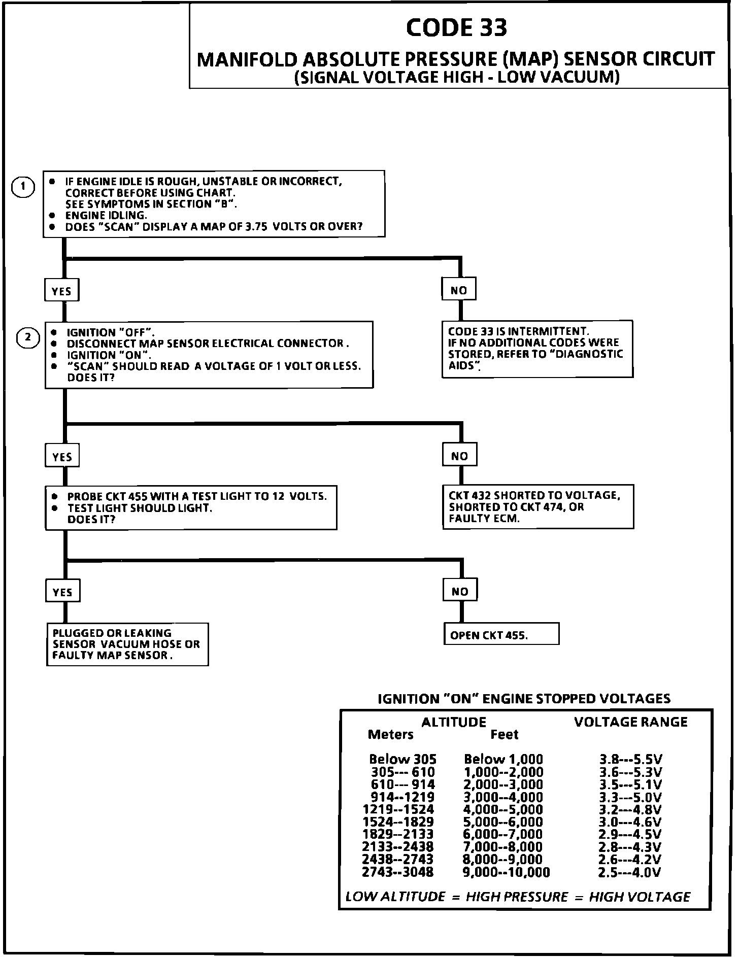 ^ Engine misfire or a low unstable idle may set a code 33.