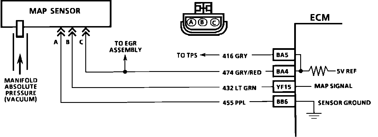 The manifold absolute pressure sensor (MAP) responds to changes in vacuum (manifold pressure). The ECM recieves this information as a voltage that varies from about 1 to 1.5 volts at idle (high vacuum) to 4-4.5 volts at wide open throttle (low vacuum).