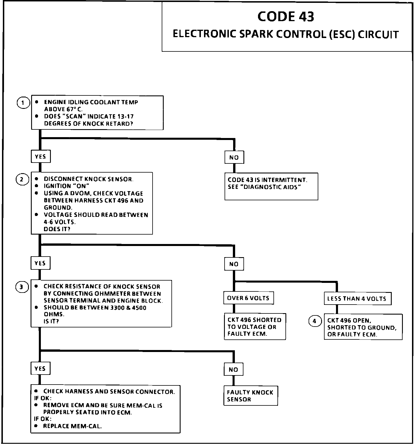 1. This step determines if the condition for a Code 43 still exist (voltage on CKT 496 above 3.5 volts or below 1.5 volts). The system is designed to retard the timing 15~ if either condition exist.