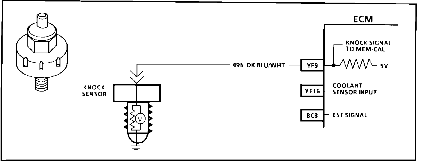 2. The ECM has a 5 volt pullup resistor, which applies 5 volts to circuit 496. The 5 volt signal should be present at the knock sensor terminal during these test conditions.