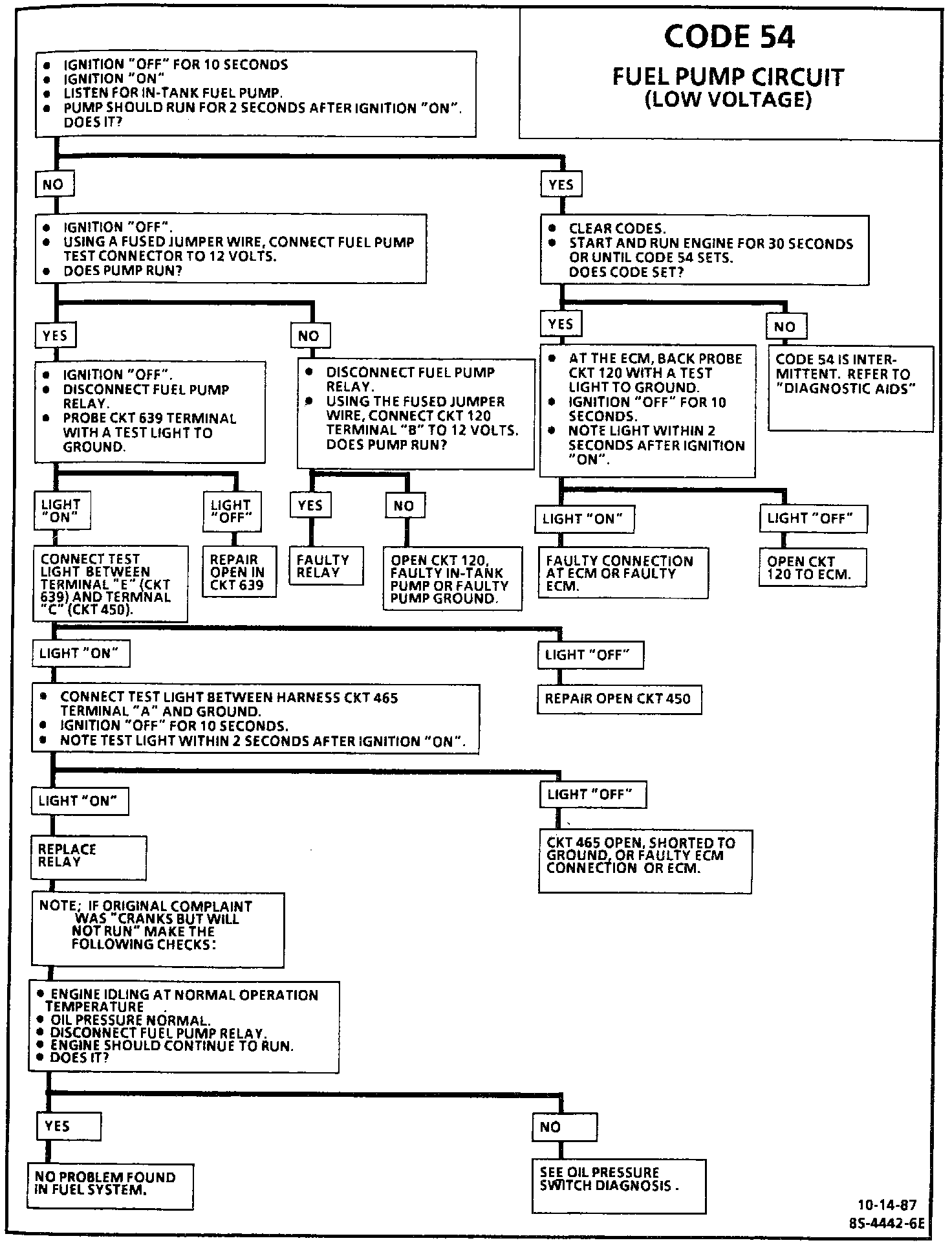Code 54 will set, if the voltage at terminal "YE13" is less than 4 volts for 0.5 seconds since the last reference pulse was received. This code is designed to detect a faulty relay, causing extended crank time, and the code will help the diagnosis of an engine that "CRANKS BUT WILL NOT RUN".