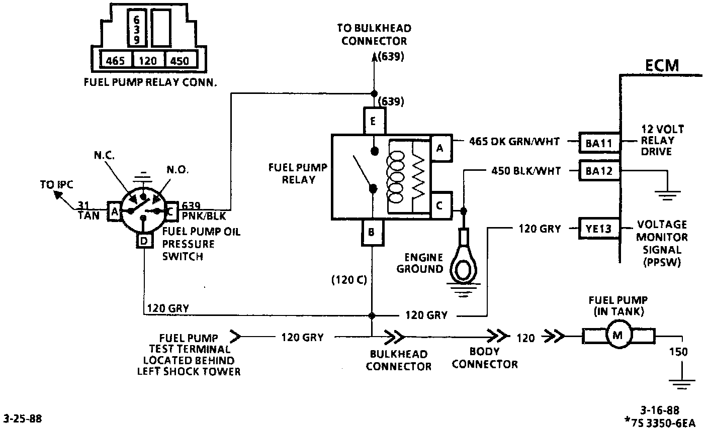 The status of the fuel pump CKT 120 is monitored by the ECM at terminal "YE13" and is used to compensate fuel delivery based on system voltage. This signal is also used to store a trouble code, if the fuel pump relay is defective or fuel pump voltage is lost, while the engine is running. There should be about 12 volts on CKT 120 for 2 seconds, after the ignition is turned "ON," or any time references pulses are being received by the ECM.
