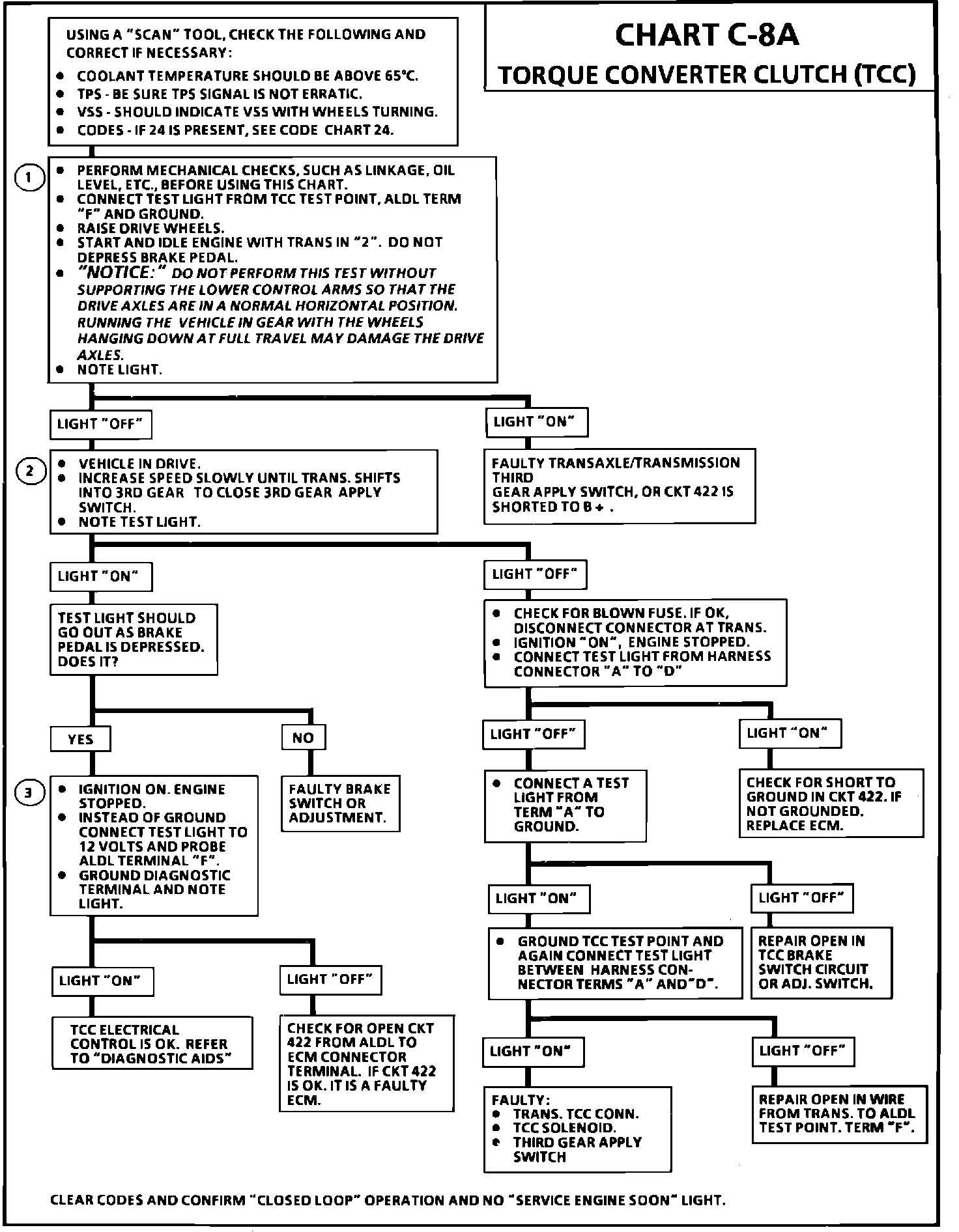 3. Grounding the diagnostic terminal with ignition "ON", engine "OFF," should energize the TCC solenoid by grounding CKT 422. This test checks the ability of the ECM to supply a ground to the TCC solenoid. The test light connected from 12 volts to ALDL terminal "F" will turn "ON" as CKT 422 is grounded.