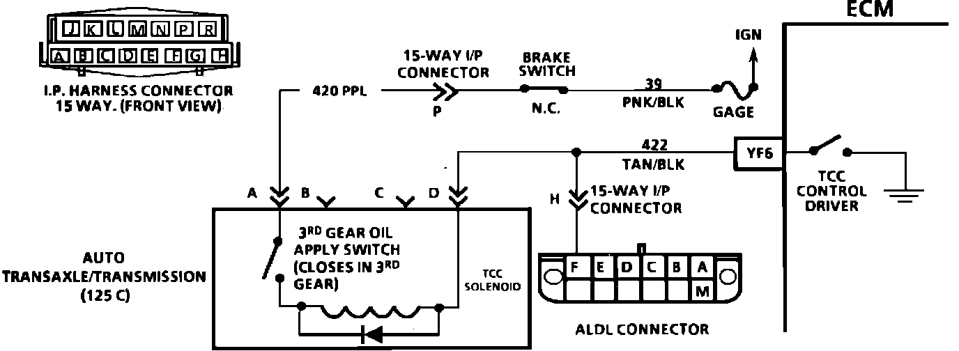 The purpose of the torque converter clutch feature is to eliminate the power loss of the transmission converter stage when the vehicle is in a cruise condition. This allows the convenience of the automatic transmission and the fuel economy of a manual transmission. Fused battery ignition is supplied to the TCC solenoid through the brake switch, and transmission third gear apply switch. The ECM will engage TCC by grounding CKT 422 to energize the solenoid.
