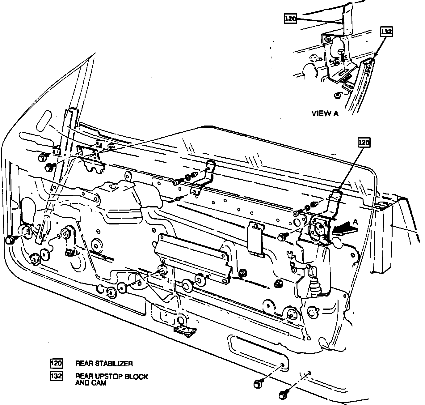 Lower window slightly so it does not engage rear up-stop (132). Loosen rear up-stop block bolt, and lower block slightly. DO NOT OVER ADJUST. Tighten up-stop block bolt. Repeat Inspection Check # 1 for proper operation. Readjust if necessary. Replace items previously removed.