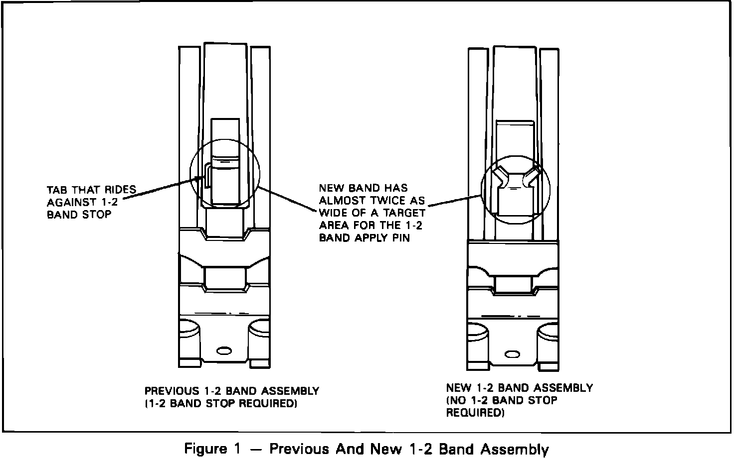 This bulletin covers a new style 1-2 band assembly that will be used in production of all HYDRA-MATIC 4T60 (THM 440-T4) and THM F-7 transaxles. The area on the new 1-2 band assembly where the 1-2 band apply pin engages is almost twice as wide as the previous style. This increased area makes for a larger "target" for the 1-2 band apply pin and eliminates the need for the 1-2 band stop.
