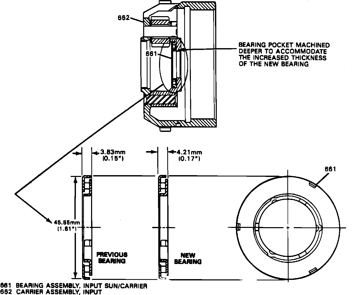 This section covers a new Input Sun Gear to Input Carrier Thrust Bearing Assembly that has increased torque capacity for higher torque engines. The new Input Sun/Carrier Bearing Assembly (661) is 0.38 mm (0.015") thicker and the Input Carrier Assembly (662) Bearing Pocket is machined deeper to accommodate the increased thickness of the new Bearing (Figure 3).