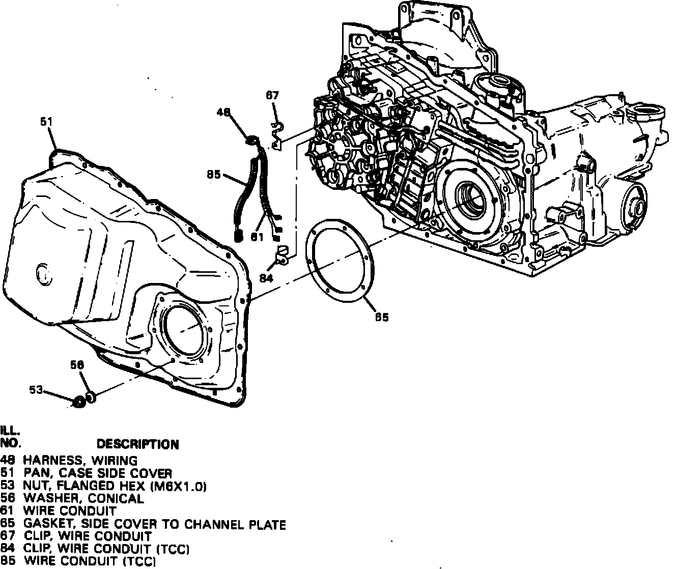 This section covers a revised wire routing for the Torque Converter Clutch Solenoid (TCC) and requires a new Wiring Harness. The TCC wires are now routed straight down from the Engine Wire Harness Connector to the TCC Solenoid instead of going around the Oil Pump Body. This reduces the possibility of the TCC wires becoming pinched/ shorted between the Pump Cover and the Case Side Cover Pan during assembly. For this change to occur, a Wire Conduit Clip (TCC) Figure 2, has been added to secure the Wire Conduit (TCC).