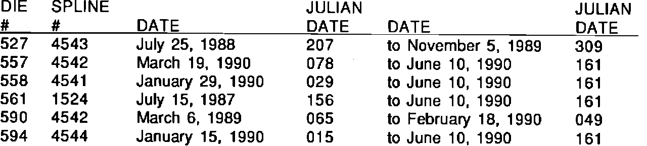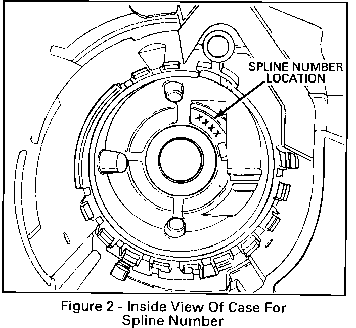 If the transaxle exhibits any of the symptoms discussed in this bulletin, inspect the case die number as shown in Figure 1 and the transaxle Julian Date. If the case die number matches the suspect numbers and the transaxle Julian Date is after the dates listed, disassemble the transaxle and check the case spline number (Figure 2) (located deep inside the barrel of the case next to the right axle seal). If it is listed below, replace the case. If the transaxle is not a suspect unit, then refer to the Automatic Transaxle Diagnosis section of the Service Manual for repair procedures.