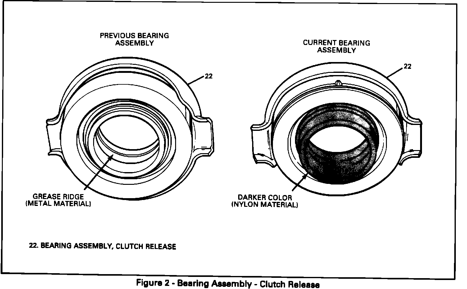 bent or heavily worn; then the release bearing and input shaft bearing/sleeve assembly should be replaced. A new release bearing with a nylon lined inner diameter (Fig. # 2) and a new input shaft sleeve/bearing assembly with a different surface finish are available. Installing a new release bearing on a damaged input shaft sleeve/ bearing assembly will result in only a temporary repair for the customer.