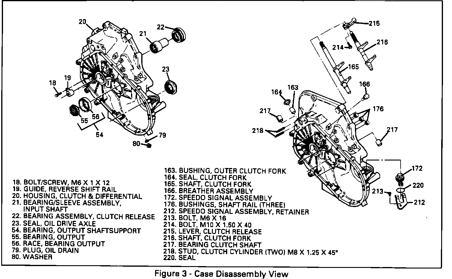 2. Reference Fig. # 3. Inspect the sliding contact areas between the release bearing and input shaft bearing/sleeve assembly. Also inspect the release bearing pads (fork contact points) for wear or bending. Use solvent to clean the parts. If the sliding contact areas are heavily scored, grooved or galled or if the release bearing pads are