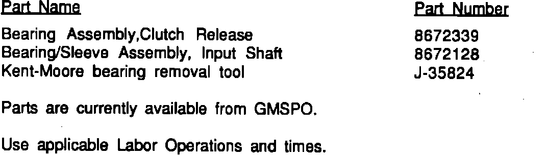Removal and replacement of the input shaft bearing/sleeve assembly should be performed per Service Manual Section 7B1 (Unit Subassembly Repair and Inspection) using Kent-Moore service tool J-35824. When pressing the old bearing out and the new one in take special care to ensure that no bearing "cocking" occurs. Bearing "cocking" may very well result in bearing pocket damage, clutch housing cracking, or premature bearing wear. If the tool is not available, or there was any damage to the clutch housing while pressing the bearing in or out, a new housing should be used.