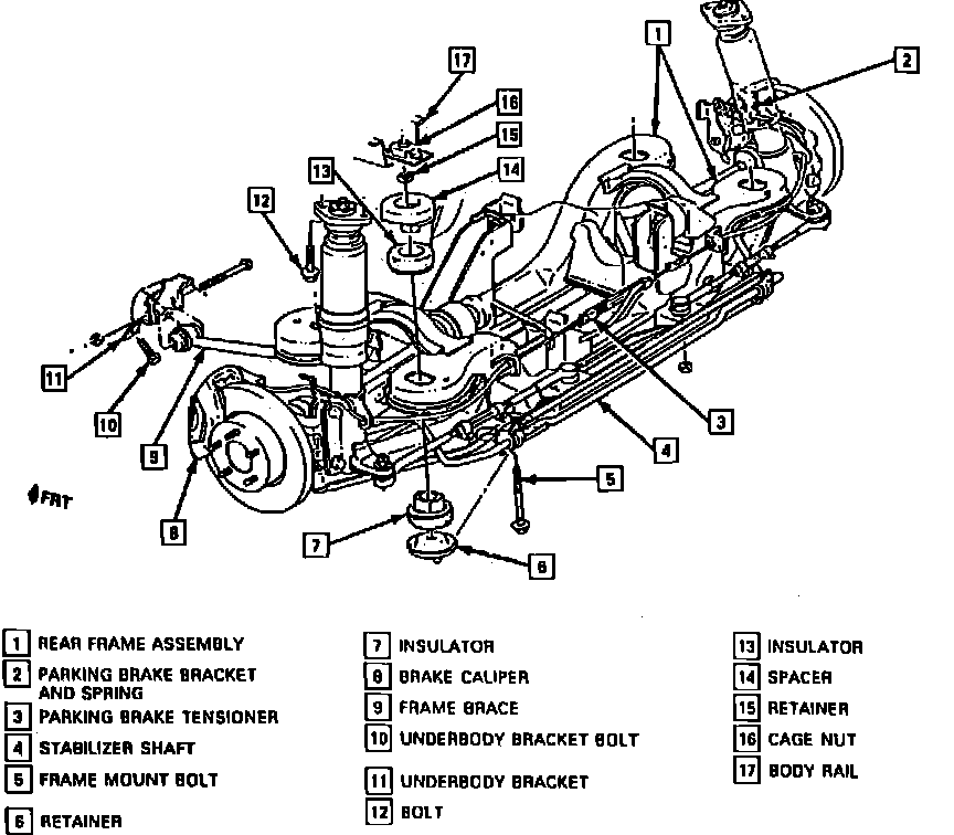 9. Remove frame brace to underbody bracket bolts, then install spring compressor No. J-33432 on leaf spring to support control arm.