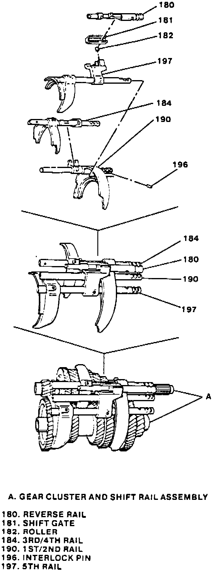 d. Remove reverse rail assembly (180), shift gate (181), then disengage roller (182).