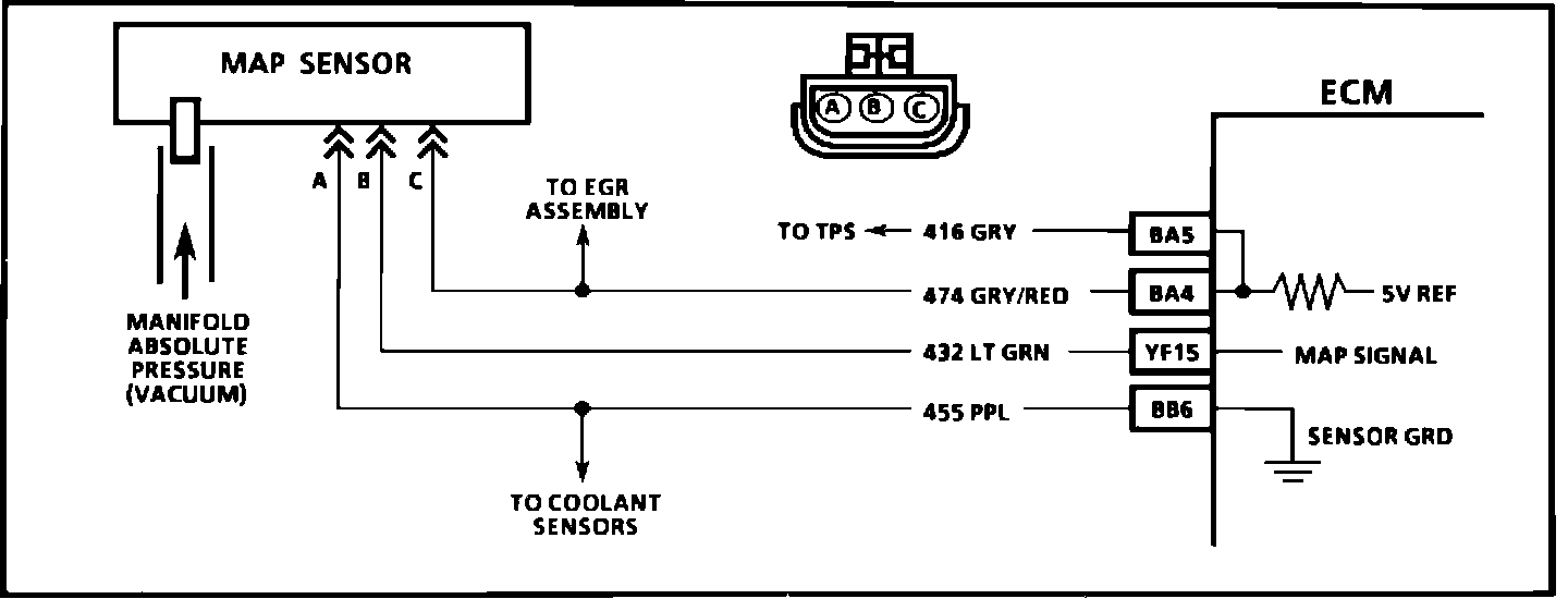 The manifold absolute pressure (MAP) sensor responds to changes in manifold pressure (vacuum). The ECM receives this information as a signal voltage that will vary from about 1 to 1.5 volts at idle to 4-4.5 volts at wide open throttle.