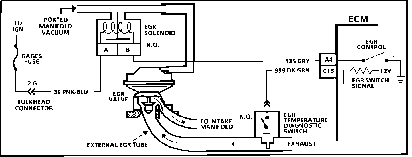 The Exhaust Gas Recirculation (EGR) valve vacuum is controlled by an Electronic Control Module (ECM) controlled solenoid. The ECM will turn the EGR "ON" and "OFF" (Duty Cycle) by grounding CKT 435. The duty cycle is calculated by the ECM based on information from the coolant and mass air flow sensor and engine rpm's. There should be (NO EGR) when in park or neutral, Throttle Position Sensor (TPS) input below a specified value, or TPS indicating Wide Open Throttle (WOT). With the ignition "ON," engine stopped, the EGR solenoid is de-energized and, by grounding the diagnostic terminal, the solenoid is energized.