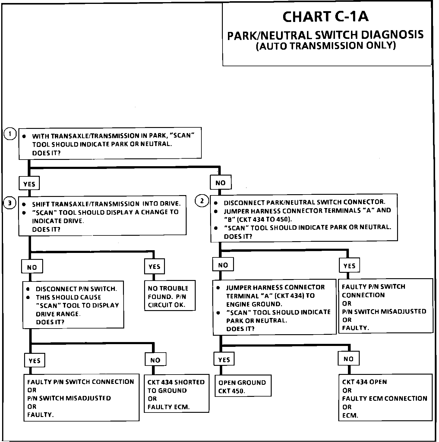 1. Checks for a closed switch to ground in park position. Different makes of "Scan" tools will read P/N differently. Refer to operators manual for type of display used for a specific tool.