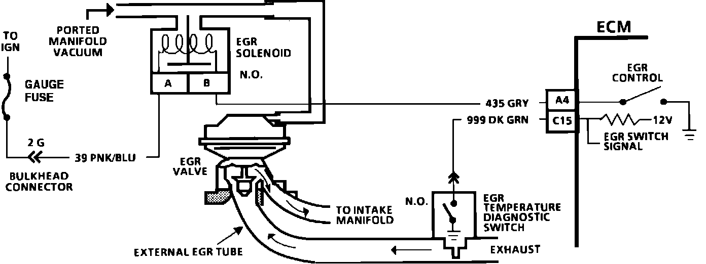 The EGR valve is controlled by a normally open, Pulse Width Modulated (PWM) solenoid. The ECM powers the solenoid off, to allow vacuum to flow to the EGR. The ECM turns the solenoid on to prohibit EGR operation.