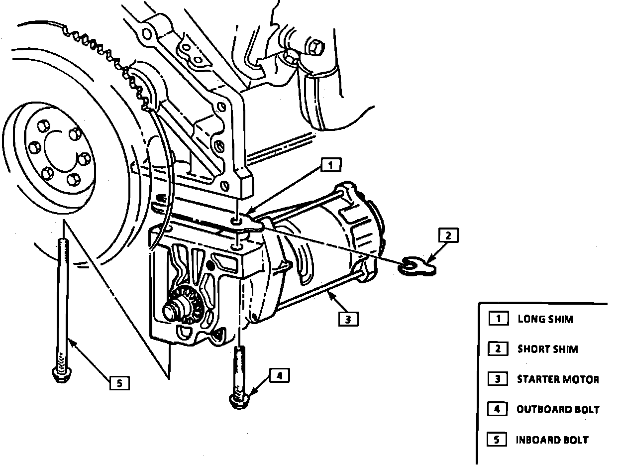 If shims are used between starter and engine block, they should be placed in their original location during installation. If starter is noisy during cranking, remove one .015 inch double shim or add one .015 single shim to the outer bolt. If starter makes a high pitched whine after firing, add .015 inch double shims until noise ceases.